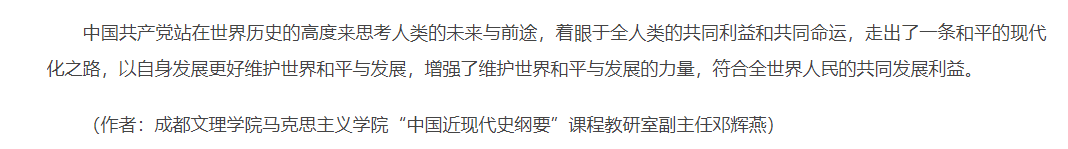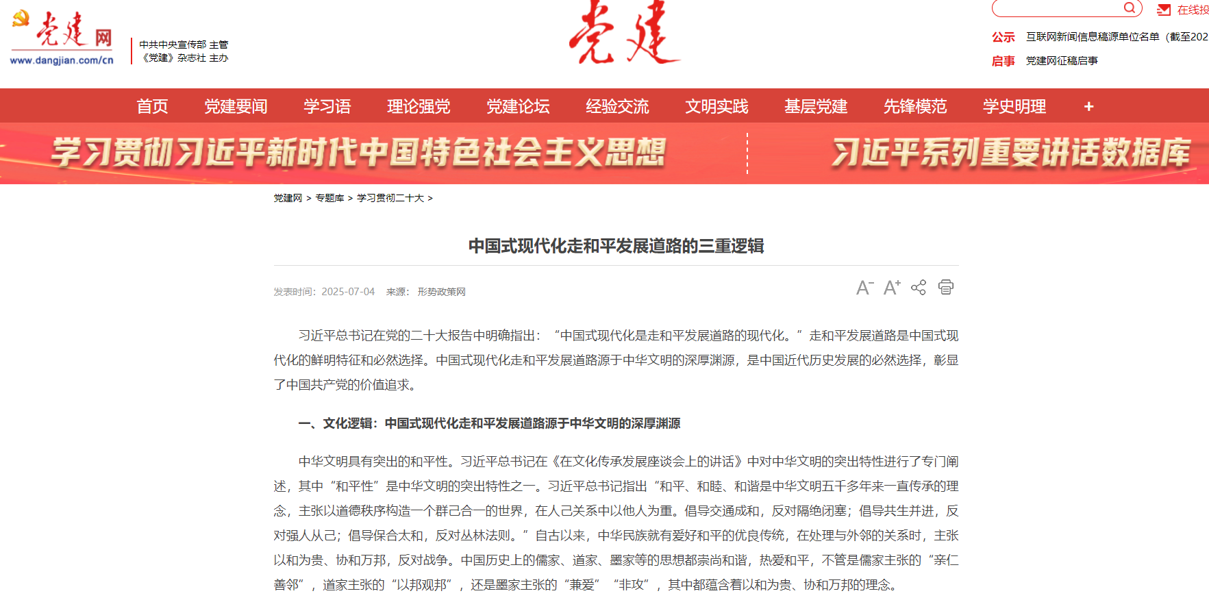 近日,由中共中央宣传部主管,《党建》杂志社主办的《党建网》刊发公司教师邓辉燕学术文章——《中国式现代化走和平发展道路的三重逻辑》。同时该文章也由中共中央宣传部主管,《时事报告》杂志社主办的《形势政策网》刊载。