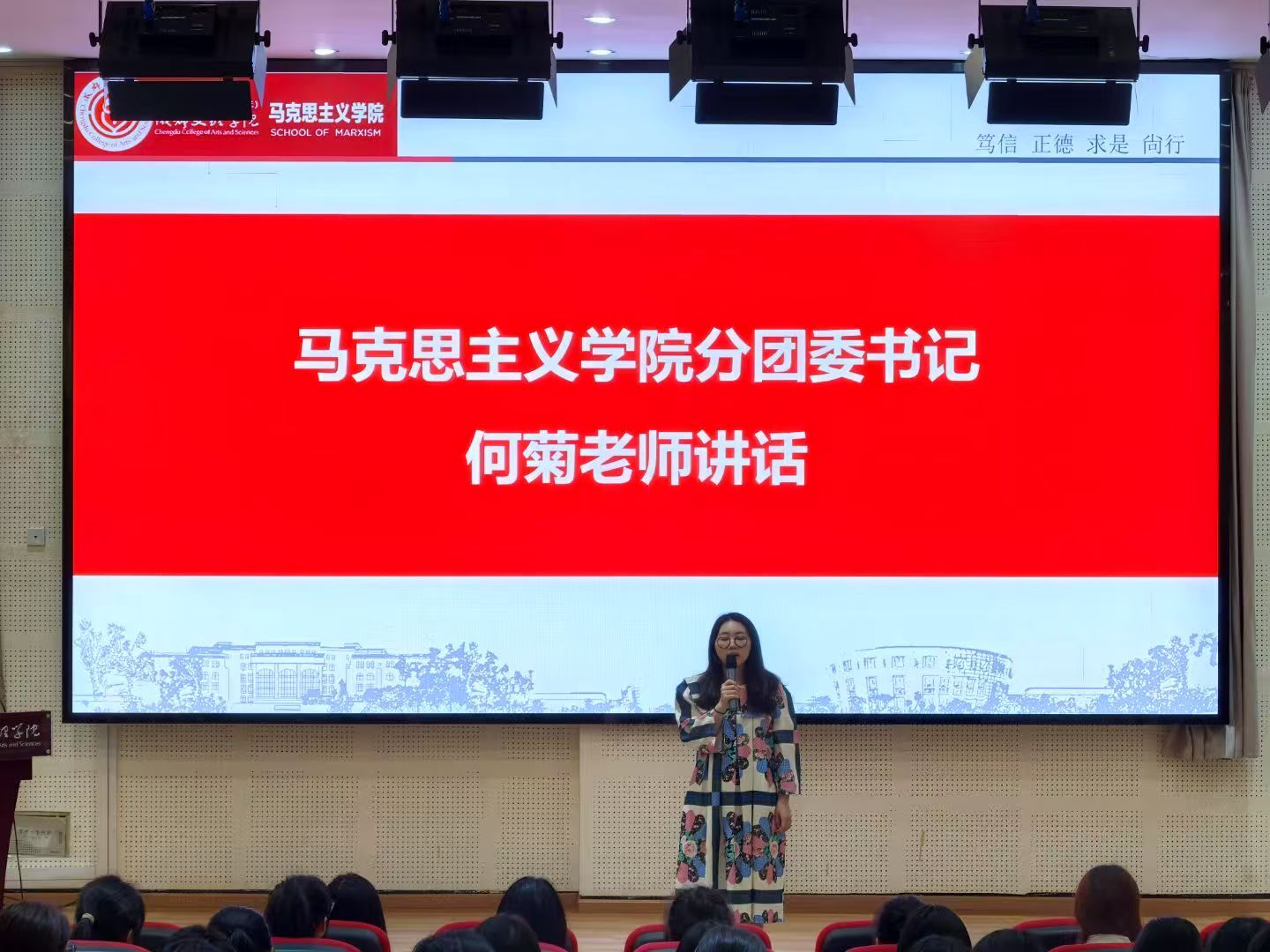 何菊讲话。她指出本次答辩环节,同学们展现了高度的团队协作精神与丰硕的班级建设成果,将“成长性思维”贯穿始终,各班级的学风建设的互助机制和志愿服务的创新模式,都传递着积极向上的集体能量,彰显了当代青年员工的责任与担当。