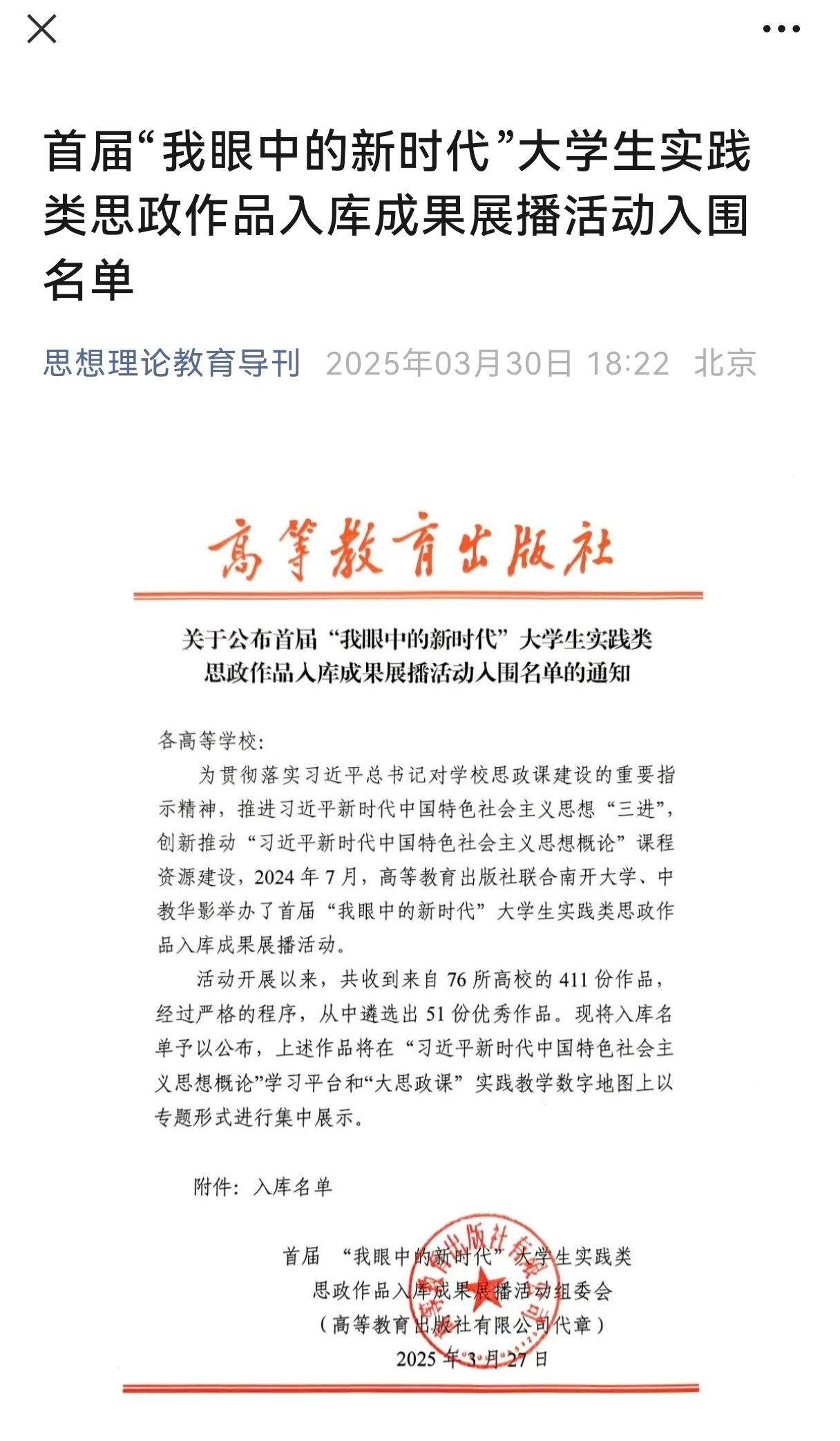 活动自2024年7月启动以来,吸引了全国76所高校共计411件作品的积极参与。经过严格的评选程序,公司员工的两部作品凭借其独特的视角、深刻的内容和出色的表现力脱颖而出,成功入选最终展示名单。作品将在“习近平新时代中国特色社会主义思想概论”学习平台和“大思政课”实践教学数字地图上以专题形式进行集中展示,为更广泛的观众所熟知和欣赏。