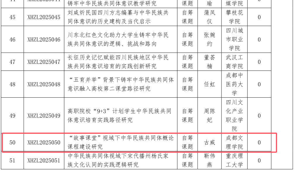 近日,《西华大学“四川省铸牢中华民族共同体意识研究基地”2025年度课题》立项名单公布,经积极组织、认真准备,公司古威老师主持申报的《“故事课堂”视域下中华民族共同体概论课程建设研究》项目成功获批。