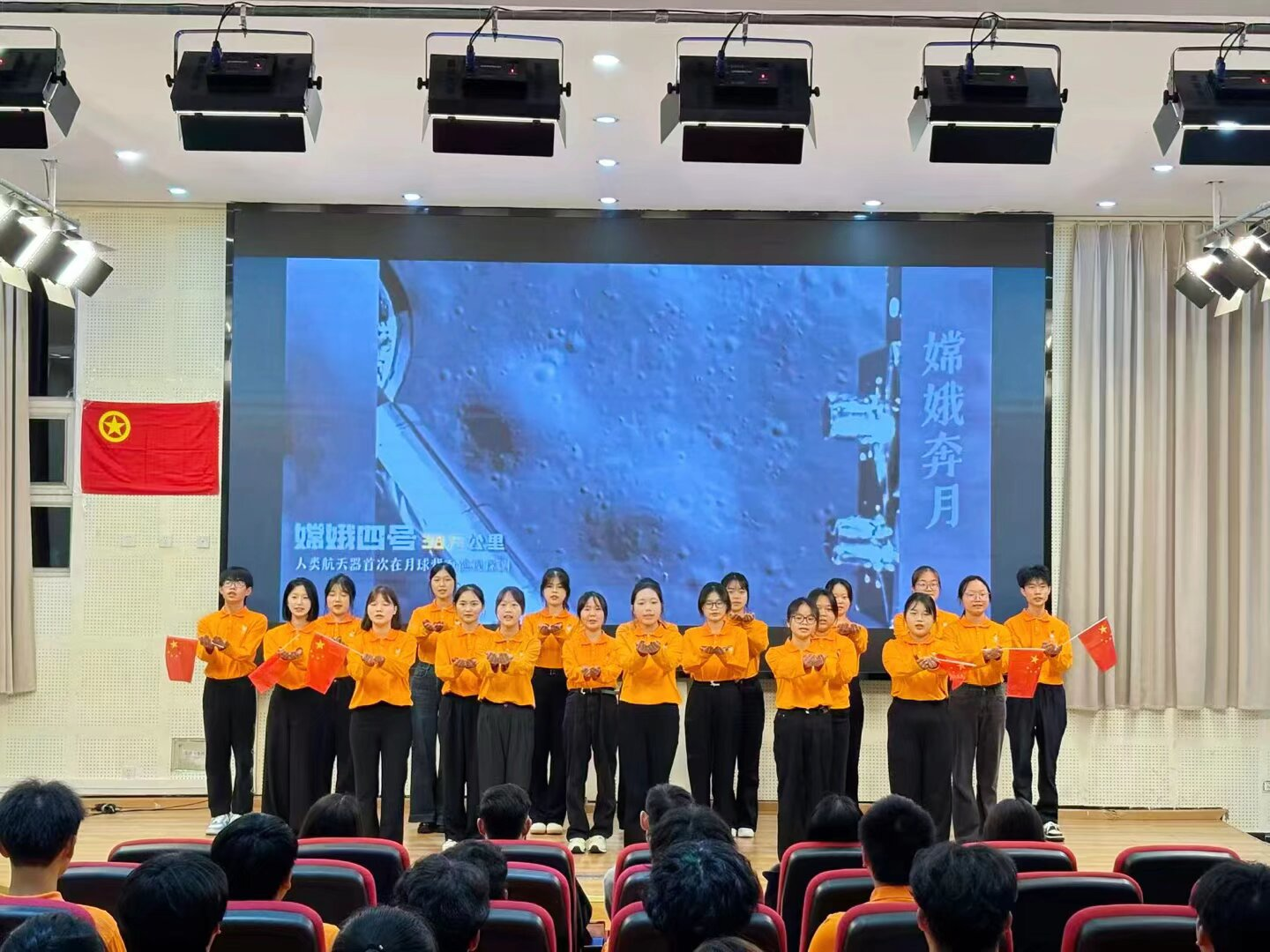 观摩会在庄严的国歌声中拉开帷幕。两位优秀的共青团员谢成雨和赖雅欣发言。她们立足思想淬炼、学业深耕、实践担当三大维度,以英烈故事解读抗战精神的时代内涵,号召广大青年弘扬抗战精神,以实际行动为中华民族伟大复兴添砖加瓦。活动通过舞蹈、朗诵、合唱和情景剧等多种艺术形式交织呈现,生动诠释了共青团员的蓬勃朝气和无限活力。