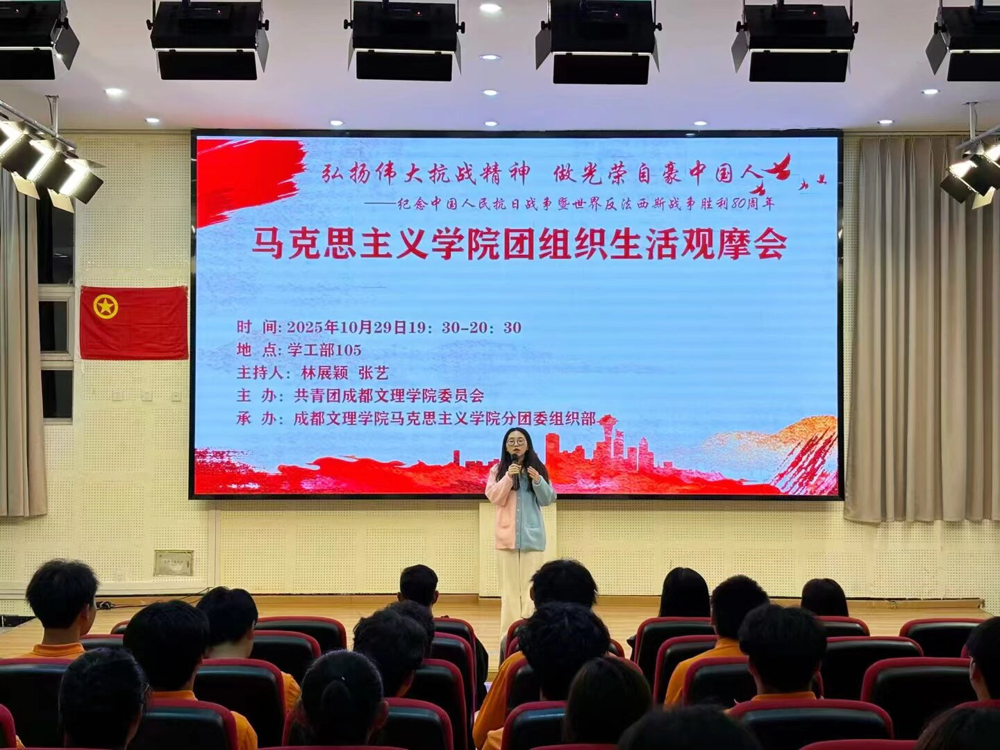 为纪念中国人民抗日战争暨世界反法西斯胜利80周年,引导广大团员青年深刻铭记抗战历史,在历史中汲取精神。公司在10月29日于学工部105开展以“弘扬伟大抗战精神,做光荣自豪中国人”为题的团组织生活观摩会。公司党总支副书记兼学工办主任袁久斌、分团委书记何菊、会计公司分团委书记成宇、传媒与演艺公司分团委书记杨婷、建筑公司分团委书记谭如兰、人工智能与大数据公司分团委书记王小琴、公司2025级辅导员张达、公司2025级全体同学以及2024级团员代表参加活动。